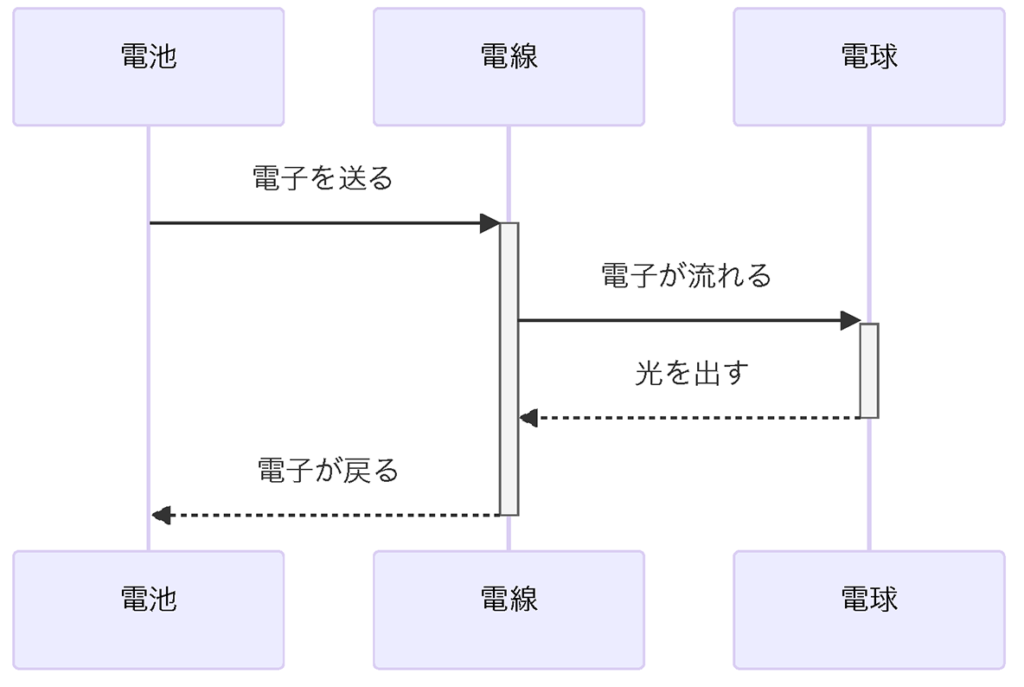 この図では、電池から電線を通って電球に電気が流れ、電球が光る様子を示しています。そして、電気は再び電線を通って電池に戻ります。これが電気の基本的な流れです。