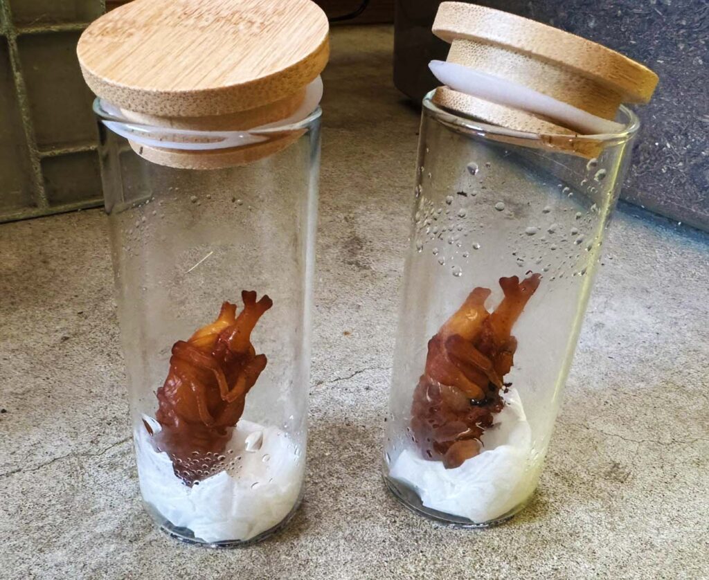 こうした場合、人工蛹室(じんこうようしつ)が必要とのことだったので、更に調べてみると、カブトムシは縦のものが必要とのことでした。一番簡単なものはトイレットペーパーの芯を使うというものでしたが、あいにく家には無かったので、100均でキャニスターを購入し、ティッシュを湿らして底に敷き、蛹を移動。