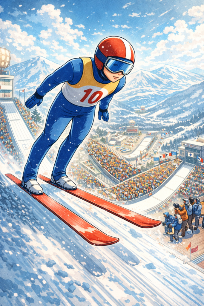 スキージャンプは、長い坂をすべってスピードを出し、空に向かってジャンプし、どれだけ遠くまで飛べるかを競うスポーツです。